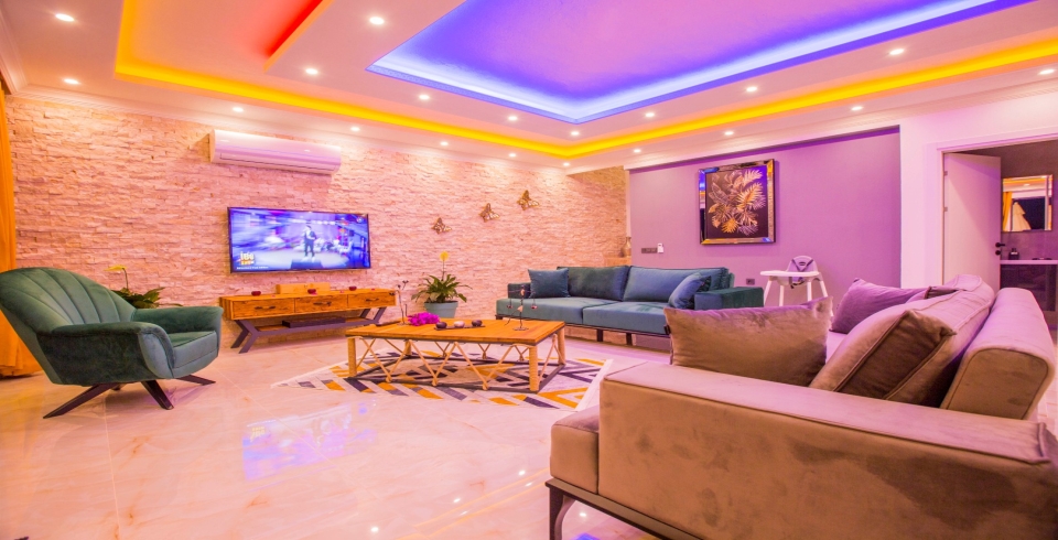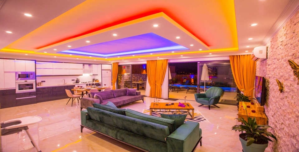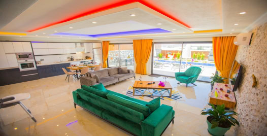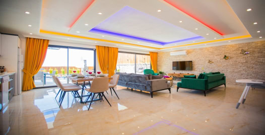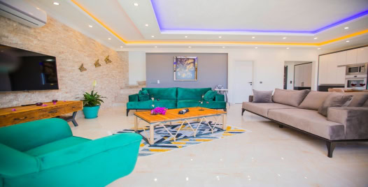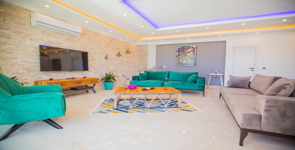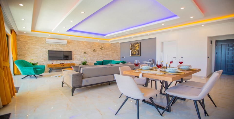 Salon : Konforunuz için özenle tasarlanan manzaralı salonu bulunmaktadır, bu modern salonda lüks bir oturma grubu, TV, klima, sehpa, DVD oynatıcı bulunmaktadır.