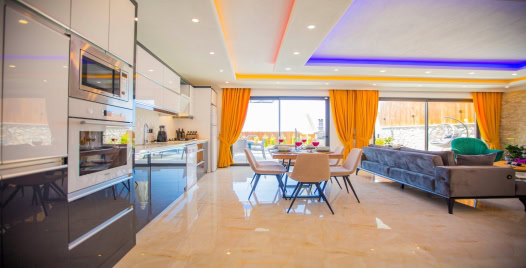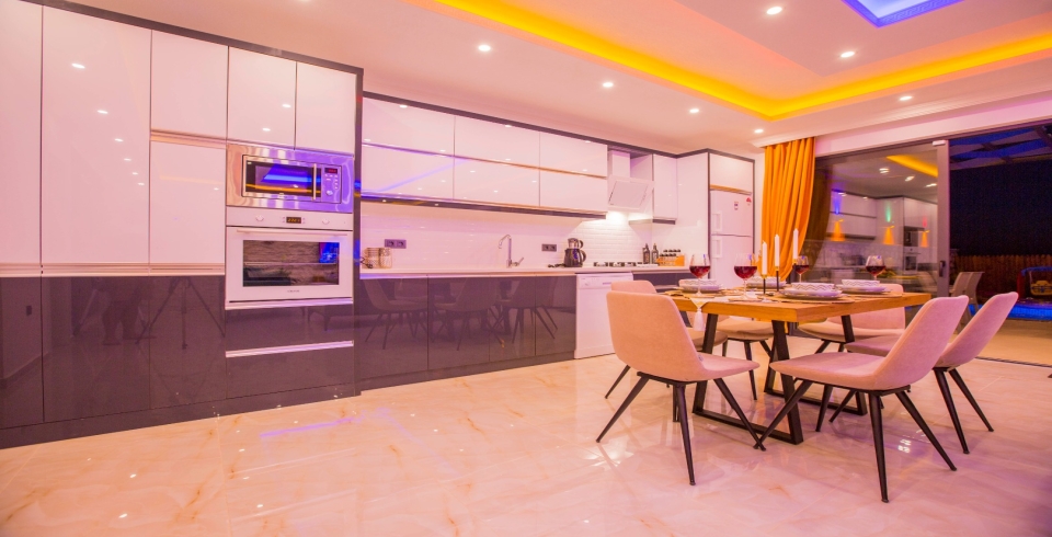 Mutfak : Her ihtiyacınıza cevap verebilen tam donanımlı modern Amerikan mutfak içerisinde; buzdolabı, bulaşık makinesi, fırın, ocak, elektrikli su ısıtıcı, yemek masası, yemek takımları, çatal ve bıçak takımları, tencere ve tava takımları ve bardaklar bulunmaktadır.
