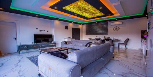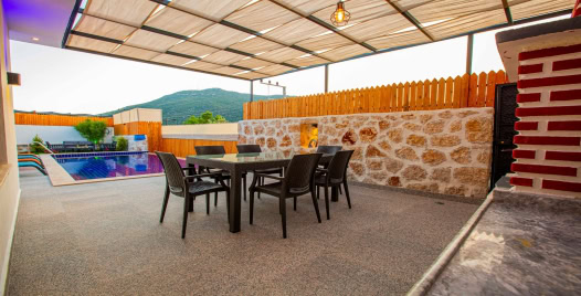 Salon: Villa salonunda konforlu oturma grubu, klima, TV, internet, uydu alıcı, yemek masası, sehpa bulunmaktadır.