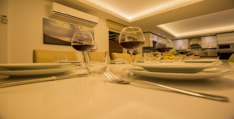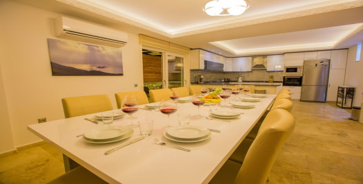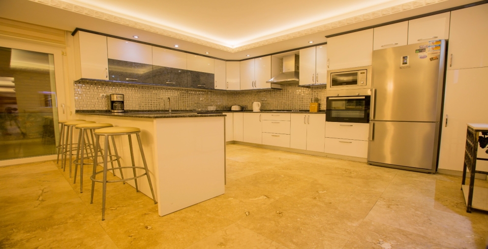 Mutfak : Villamızın geniş Amerikan mutfağı ile sizlere kendi evinizin mutfağı gibi hissettirecek. Ayrıca mutfakta klima, bulaşık makinası, buzdolabı, çamaşır makinası, mikrodalga fırın, tost makinası, ekmek kızartma, su ısıtıcısı, fırın, 4`lü ocak seti ve 12 kişilik geniş yemek masası ile tava tencere vb. mutfak araç gereçlerini kullanma fırsatını sizlere sunuyoruz.
