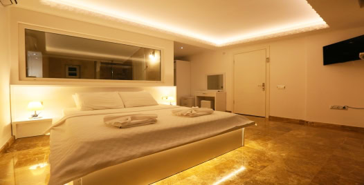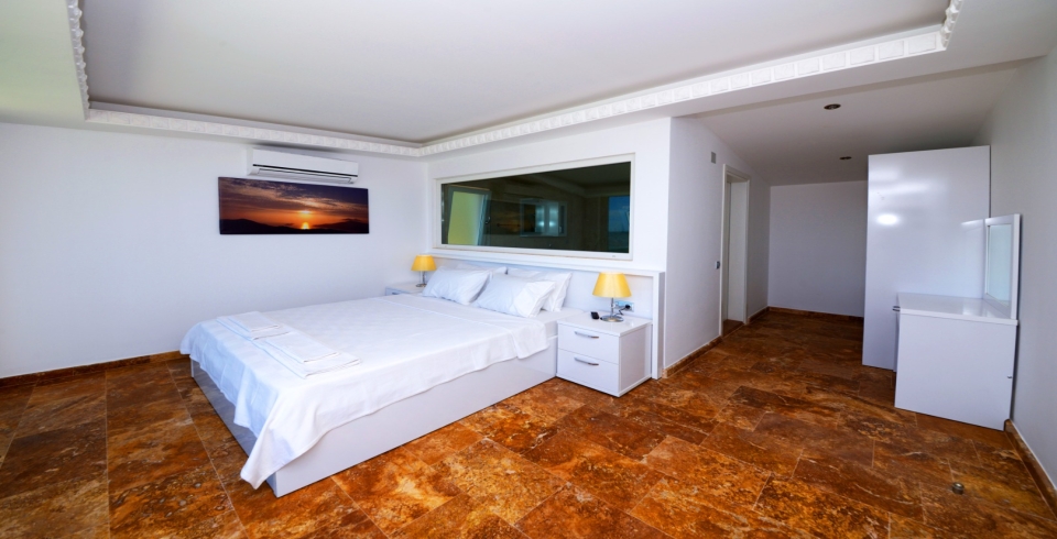 4. Yatak Odası (1. Kat) : Deniz manzaralı suit oda, 1 adet çift kişilik yatak, komodin, makyaj masası, LCD TV, Jakuzi, klima, balkon, sehpa ve sandalyeler, banyo ve tuvalet bulunmaktadır.