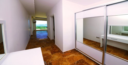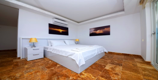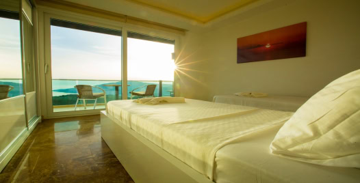 3. Yatak Odası (1. Kat) : Deniz manzaralı suit oda, 1 adet çift kişilik yatak, komodin, makyaj masası, klima, balkon, sehpa ve sandalyeler, banyo ve tuvalet bulunmaktadır.