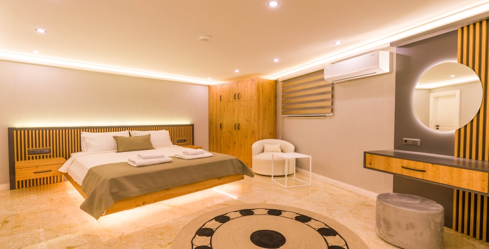 2. Yatak Odası : Bir adet çift kişilik yatak ,klima, komodin, elbise dolabı, makyaj masası, banyo ve tuvalet bulunmaktadır.