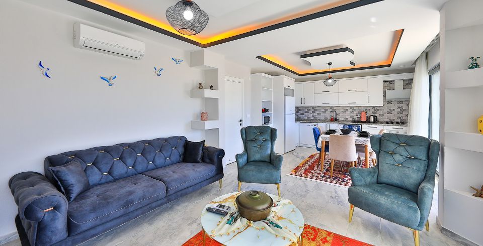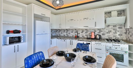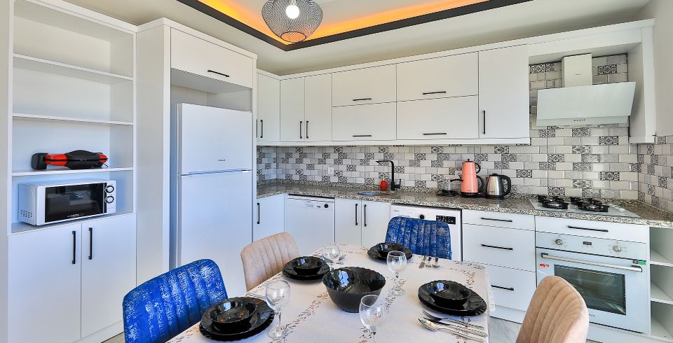 Mutfak: Amerikan mutfak bulunmaktadır. Mutfakta bulaşık makinası, ankastre fırın, buzdolabı, çamaşır makinası, ankastre 4’lü ocak, elektrikli su ısıtıcı kettle, tencere ve tava takımı, 6 kişilik yemek takımı, kaşık ve çatal seti ve bardaklar bulunmaktadır. Mutfak havuz katındadır.