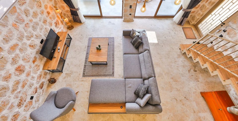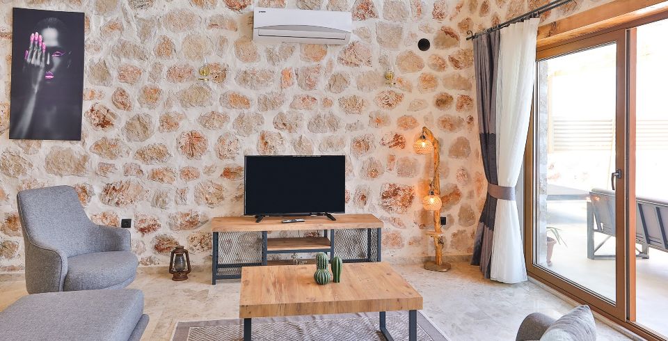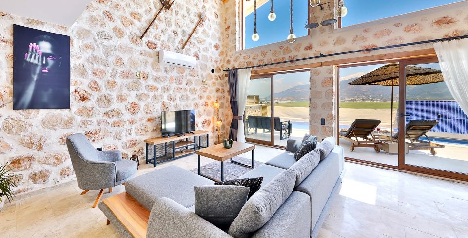 Salon: Villa salonunda konforlu oturma grubu, klima, TV, internet, uydu alıcı, yemek masası, sehpa bulunmaktadır.