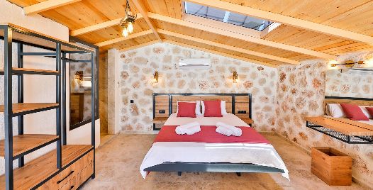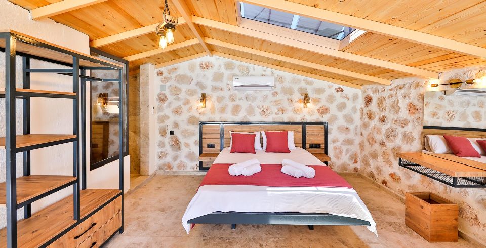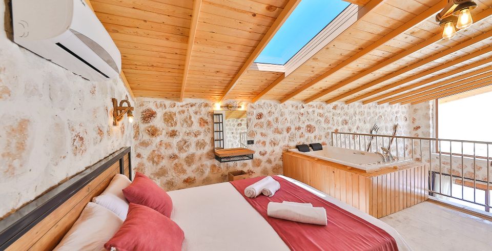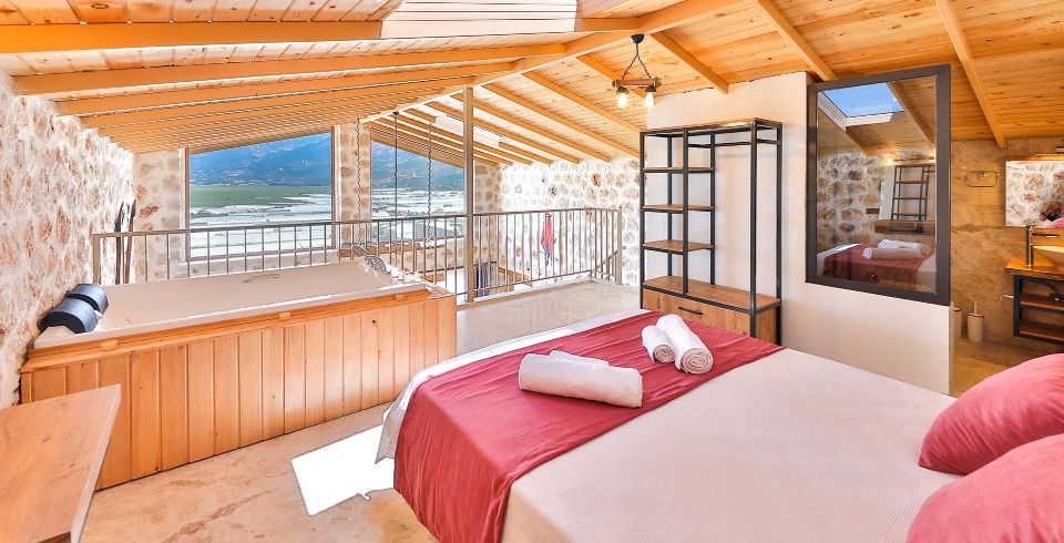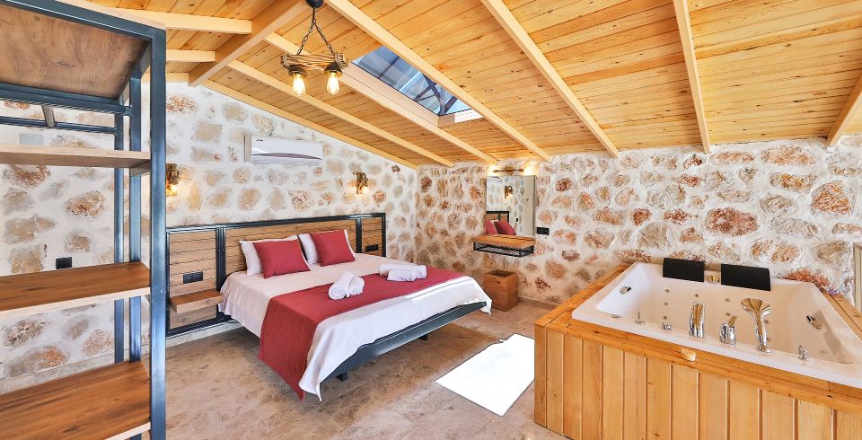 1. Yatak Odası: Çift kişilik yatak, klima, jakuzi, komodin, elbise dolabı, makyaj masası, banyo ve tuvalet bulunmaktadır.
