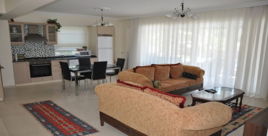 Salon: Özenle döşenmiş salon, modern koltuklar, yemek masası, LCD TV ve klima bulunmaktadır.