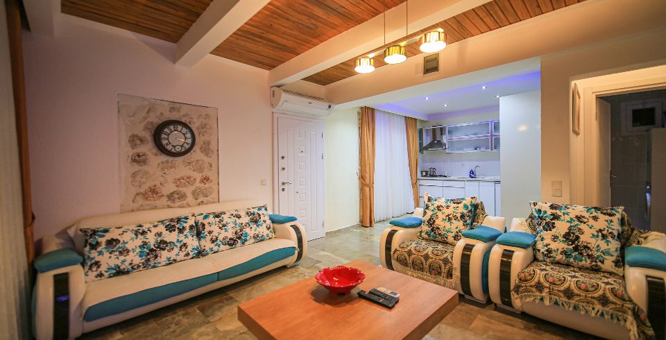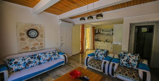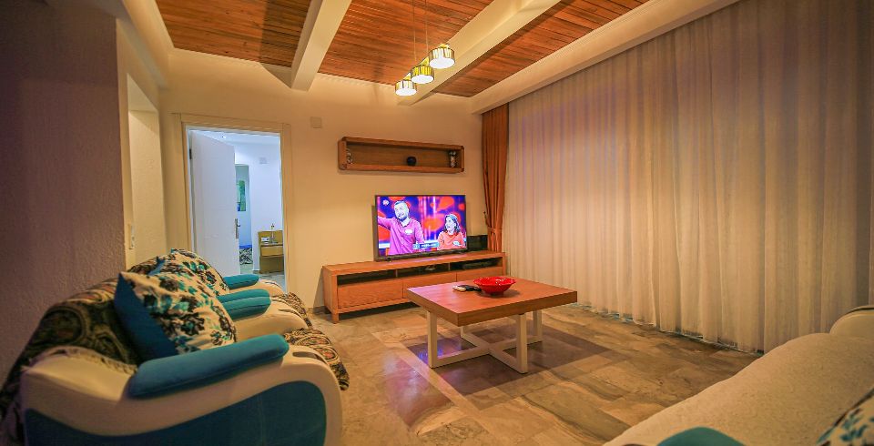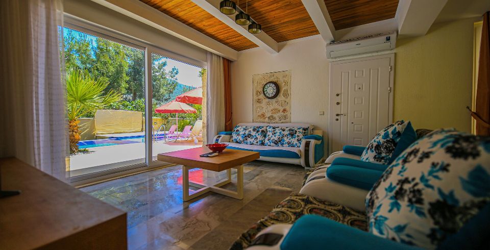 Salon : Modern tasarlanmış salonumuzda koltuk takımı, ütü, ütü masası, tv, ses sistemi, klima bulunmakta olup havuz başına geçiş yapılabilmektedir.