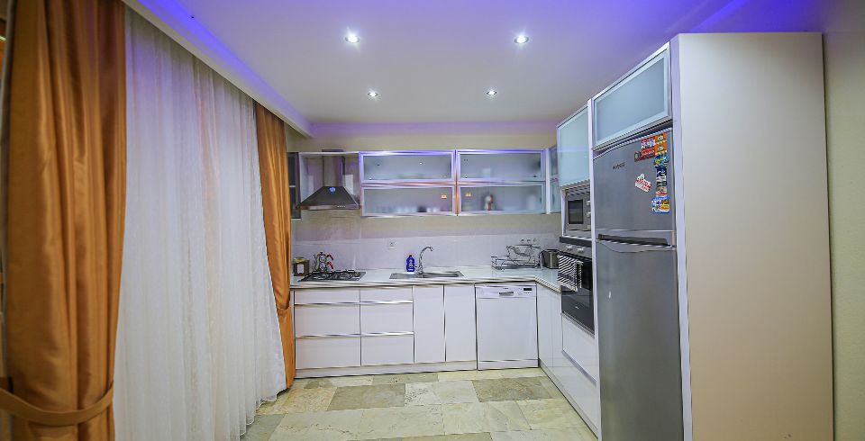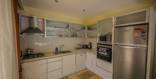 Mutfak : Şirin ve kullanışlı modern bir mutfağa sahip villamızın mutfağında buzdolabı, bulaşık makinası, su ısıtıcısı, ekmek kızarma makinası, çamaşır makinası, çaycım, mikro dalga, fırın,4'lü ankastre ocak ve mutfak araç ve gereçleri bulunmaktadır.
