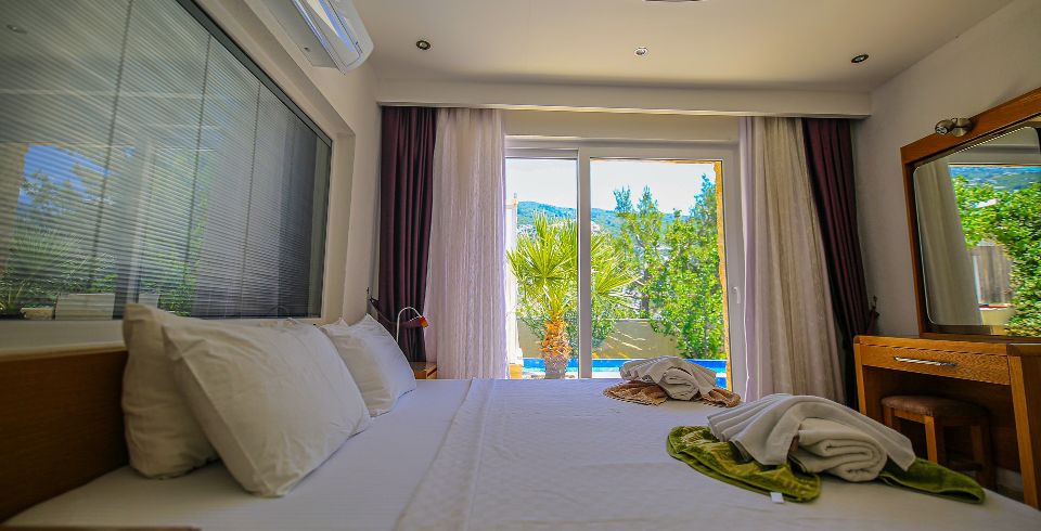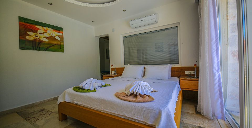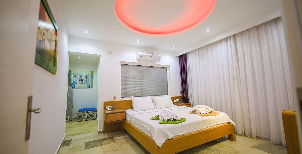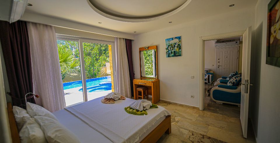 1. Yatak Odası : Çift kişilik yatak, klima, komodin, elbise dolabı, makyaj masası, jakuzi, banyo ve lavabo bulunmaktadır. Yatak odasından havuz terasına geçiş yapılmaktadır.