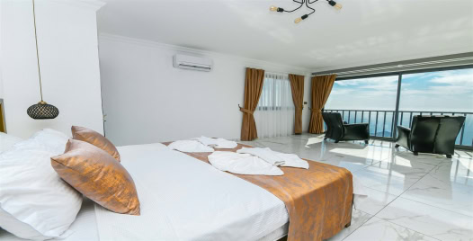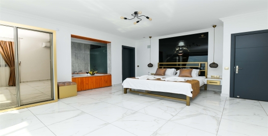 1.Yatak Odası: Süit yatak odasında; Çift kişilik yatak, makyaj masası, komodin, klima, elbise dolabı, banyo ve jakuzi bulunmaktadır.