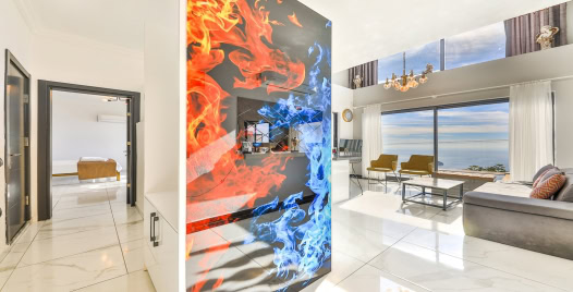 Salon : Deniz manzaralı salona sahip salonumuz; Oturma grubu, Uydu TV (LCD), Klima, 6 kişilik yemek masası, WC & Lavabo ve Havuz terasına çıkış bulunmaktadır.