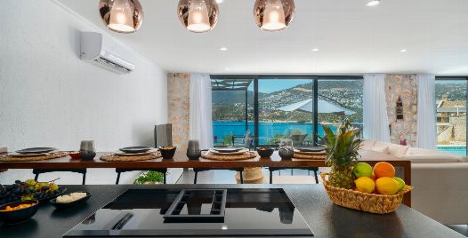 Mutfak : Modern Amerikan mutfakta bulaşık makinası, çamaşır makinası kurutma makinası buzdolabı, ankastre 4’lü ocak, fırın, elektrikli su ısıtıcı (kettle),mikrodalga fırın, ekmek kızartma makinası, tost makinesi, tencere ve tava takımları,2 kişilik yemek masası, yemek takımları, çatal ve bıçak takımları, çay, kahve ve su bardakları bulunmaktadır. Mutfak havuz katındadır.
