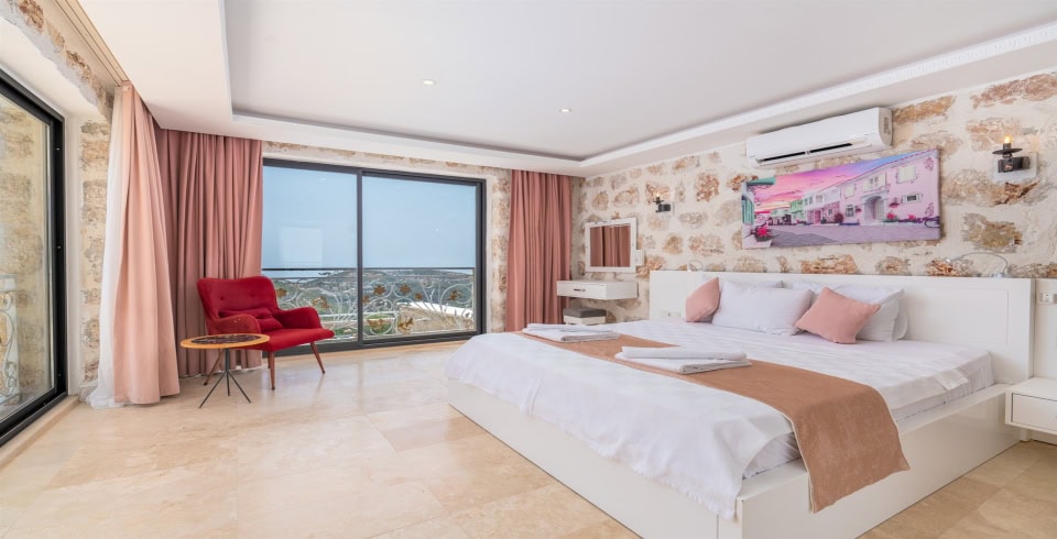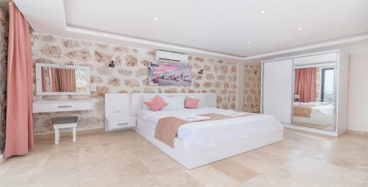 1. Yatak Odası : Çift kişilik yatak, komodin, makyaj masası, elbise dolabı, TV, klima, banyo ve lavabo bulunmaktadır.