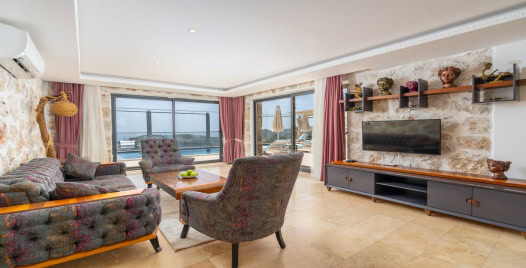 Salon : Villa salonunda oturma grubu, TV, internet, sehpa, klima bulunmaktadır.
