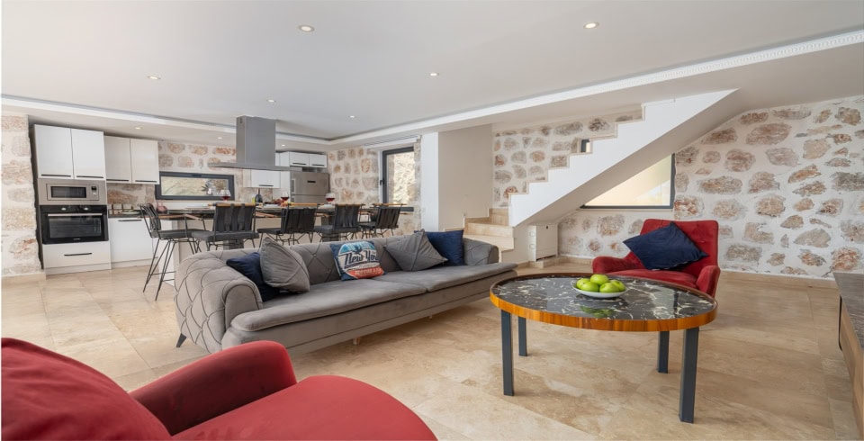 Salon : Villa salonunda oturma grubu, TV, internet, sehpa, klima bulunmaktadır.