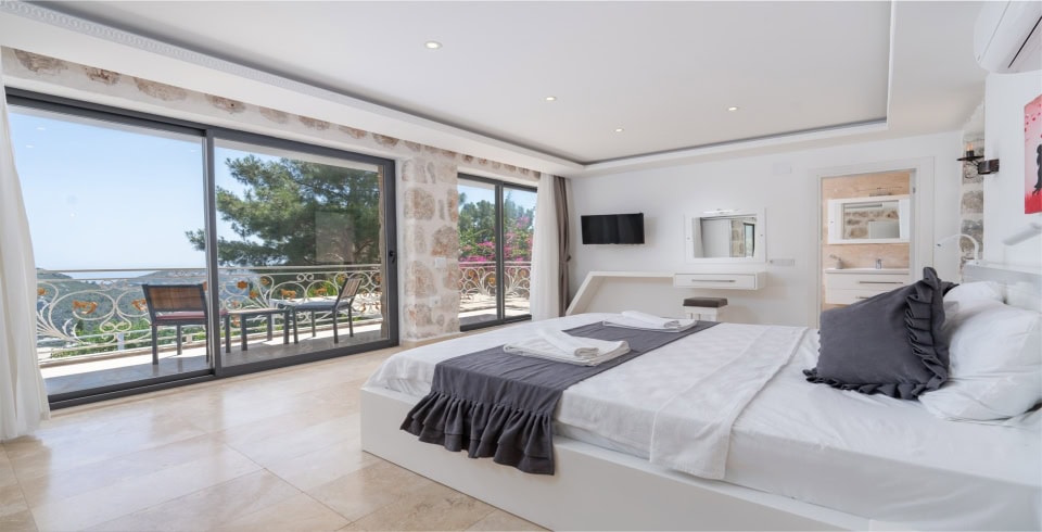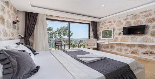 3. Yatak Odası: Çift kişilik yatak, komodin, makyaj masası, elbise dolabı, jakuzi, TV, klima, banyo ve lavabo bulunmaktadır.