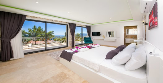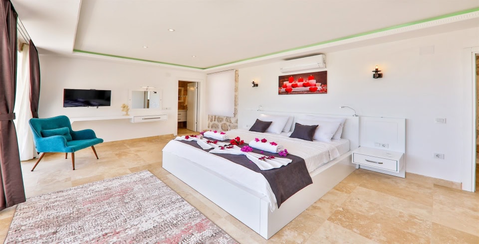 3. Yatak Odası: Çift kişilik yatak, komodin, makyaj masası, elbise dolabı, jakuzi, TV, klima, banyo ve lavabo bulunmaktadır.