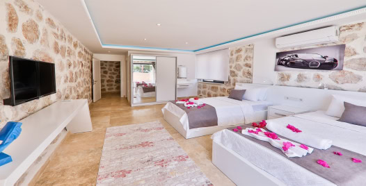 2. Yatak Odası : 2 adet tek kişilik yatak, komodin, makyaj masası, elbise dolabı, TV, klima, banyo ve lavabo bulunmaktadır.