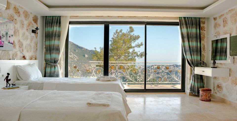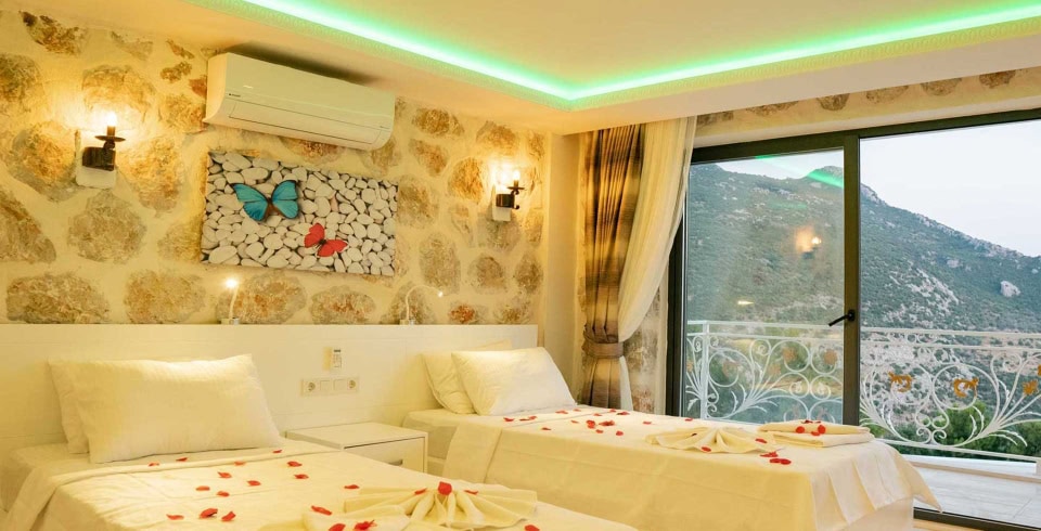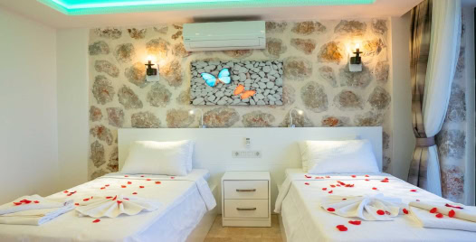 2. Yatak Odası : 2 adet tek kişilik yatak, komodin, makyaj masası, elbise dolabı, TV, klima, banyo ve lavabo bulunmaktadır.
