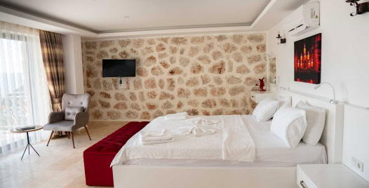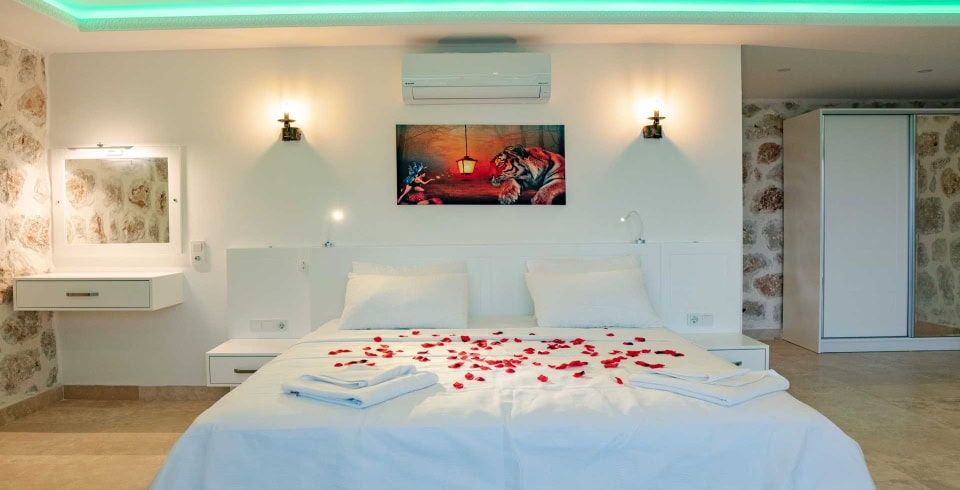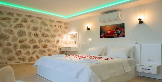1. Yatak Odası : Çift kişilik yatak, komodin, makyaj masası, elbise dolabı, TV, klima, banyo ve lavabo bulunmaktadır.