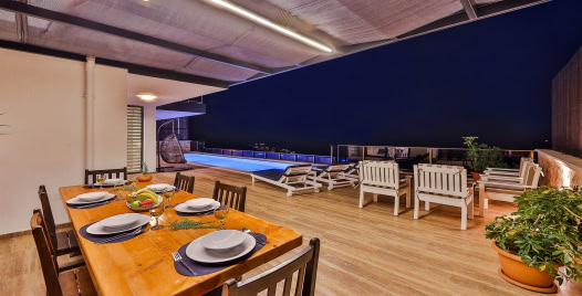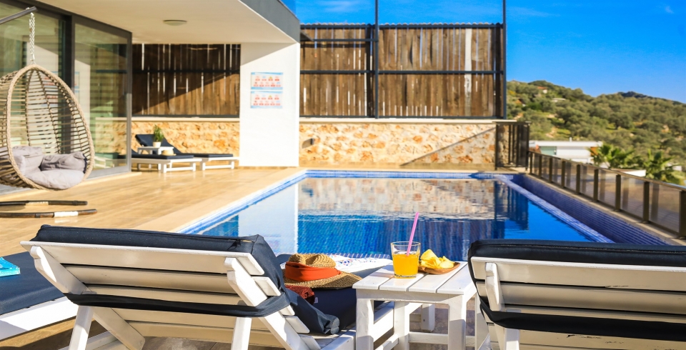 Havuz ve Bahçe: Deniz manzaralı özel yüzme havuzu, şezlong, salıncak, hamak, çocuk oyun parkı, bahçe yemek masası, barbekü bulunmaktadır.
