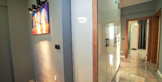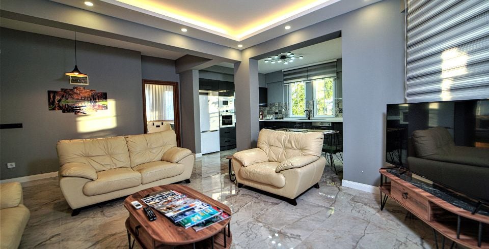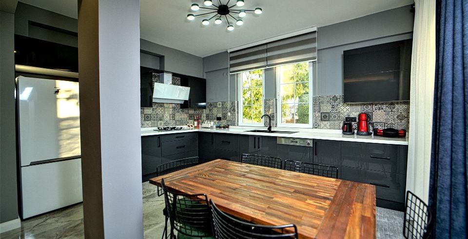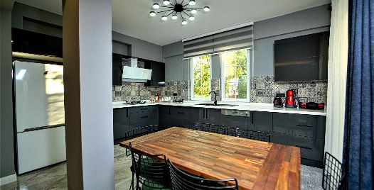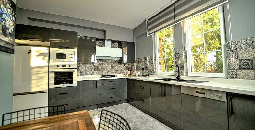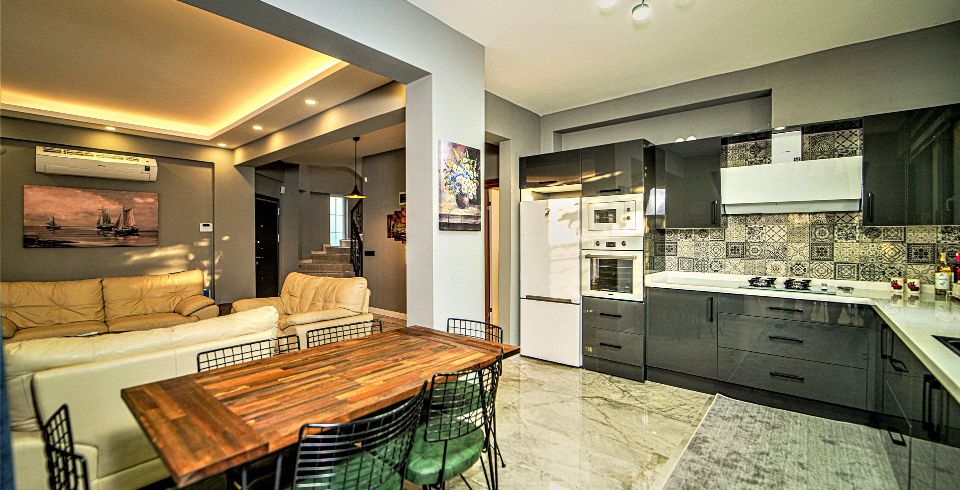 Mutfak : Modern dizaynlı, tam donanımlı Amerikan mutfak içerisinde buzdolabı, çamaşır ve bulaşık makinesi, kurutma makinesi, 4lü ocak, mikrodalga fırın, kettle, tost makinesi, yemek masası, yemek takımı, çatal bıçak takımı, tava ve tencereler bulunmaktadır.