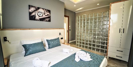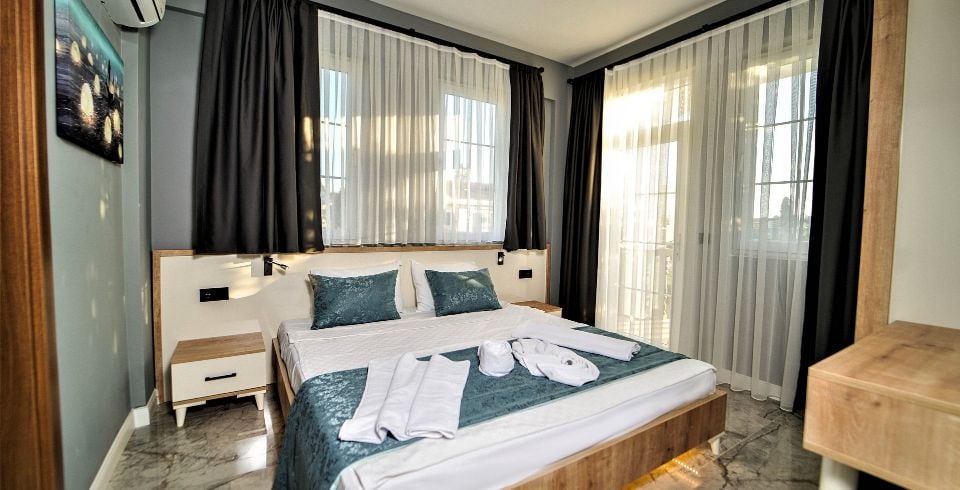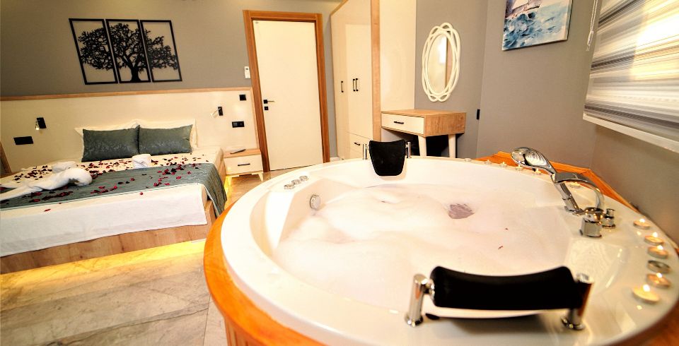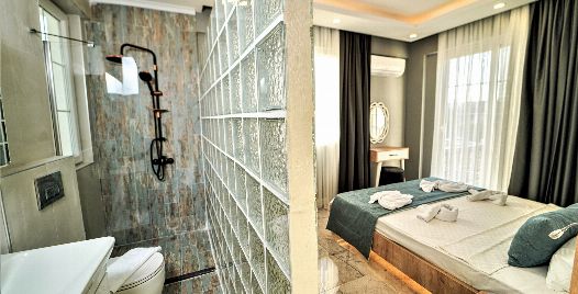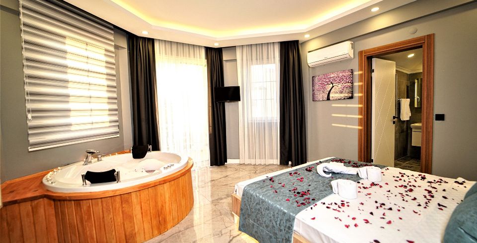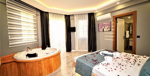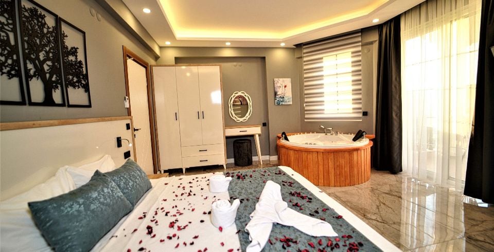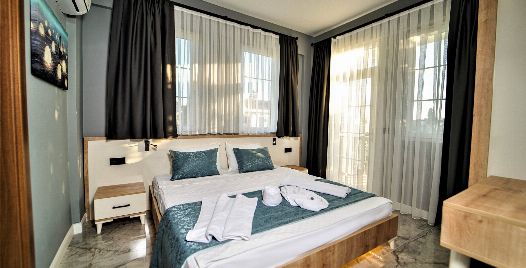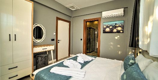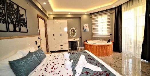 1. Yatak Odası : Süit özellikte dizayn edilmiş olan yatak odası içerisinde 1 adet çift kişilik ortopedik yatak (180x200 (XL) ölçülerinde ), klima, komodin, TV, makyaj masası, elbise dolabı, jakuzi, banyo ve tuvalet bulunmaktadır.