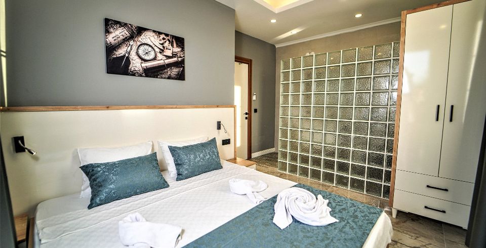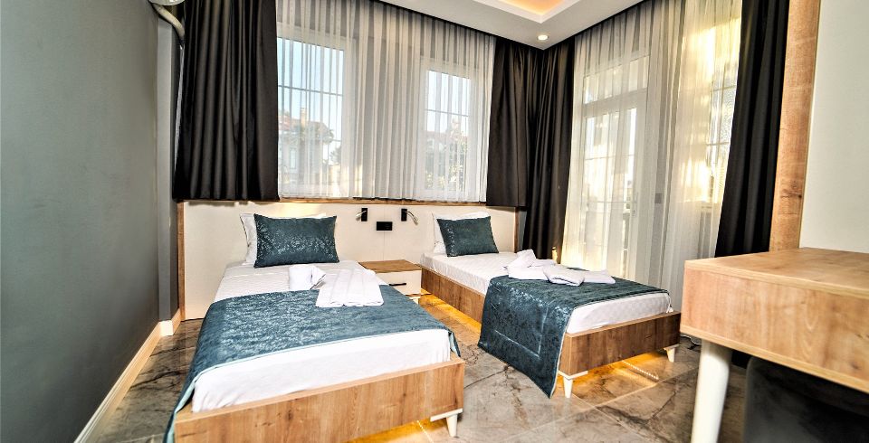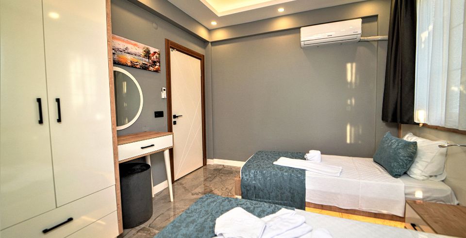 4. Yatak Odası : 2 adet tek kişilik yatak, makyaj masası, klima, elbise dolabı ve komodin bulunmaktadır. Tuvalet ve banyo odadan bağımsızdır.