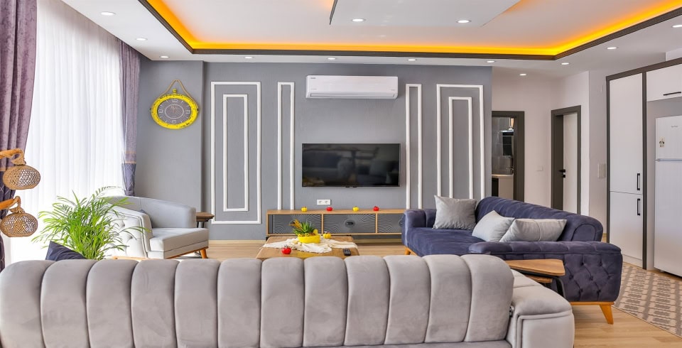 Salon : Salon içerisinde oturma grubu, TV, klima, sehpa bulunmaktadır. Havuz terasına çıkış yapılabilmektedir.