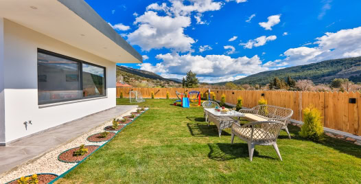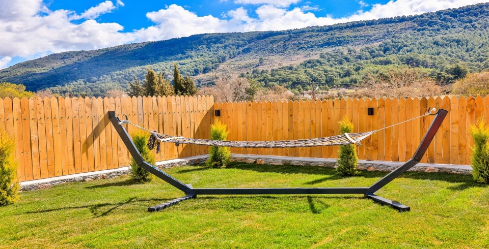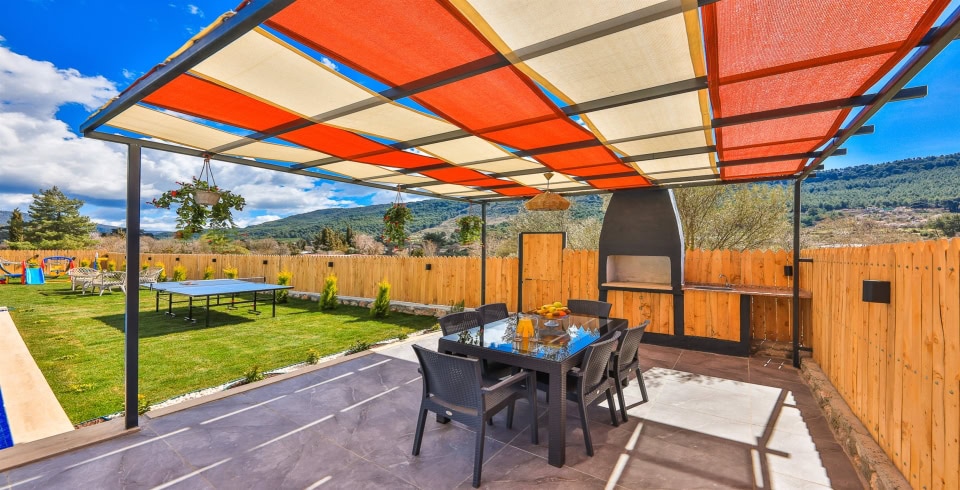 Bahçe : Bahçe içerisinde özel yüzme havuzu, şezlong, şemsiye, oturma grubu, barbekü, salıncak, hamak, masa tenisi, yemek masası bulunmaktadır.