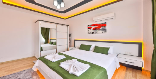 1. Yatak Odası : 1 adet çift kişilik yatak, klima, komodin, elbise dolabı, makyaj masası, TV, banyo ve tuvalet bulunmaktadır.