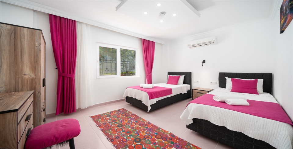 2. Yatak Odası: 2 adet tek kişilik yatak, klima, komodin, elbise dolabı, makyaj masası banyo ve tuvalet bulunmaktadır.
