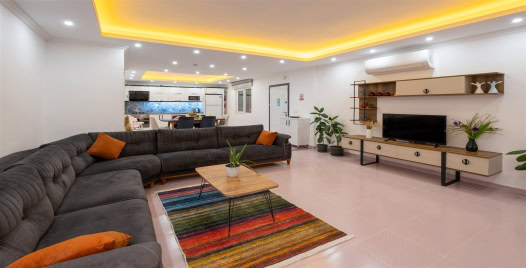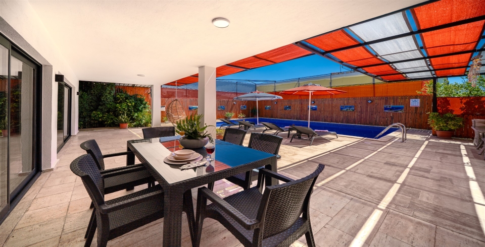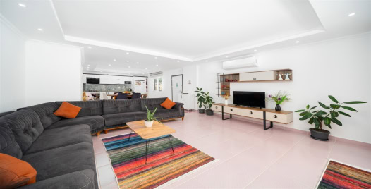 Salon: Villa salonunda konforlu oturma grubu, klima, TV, internet, uydu alıcı, yemek masası, sehpa bulunmaktadır.