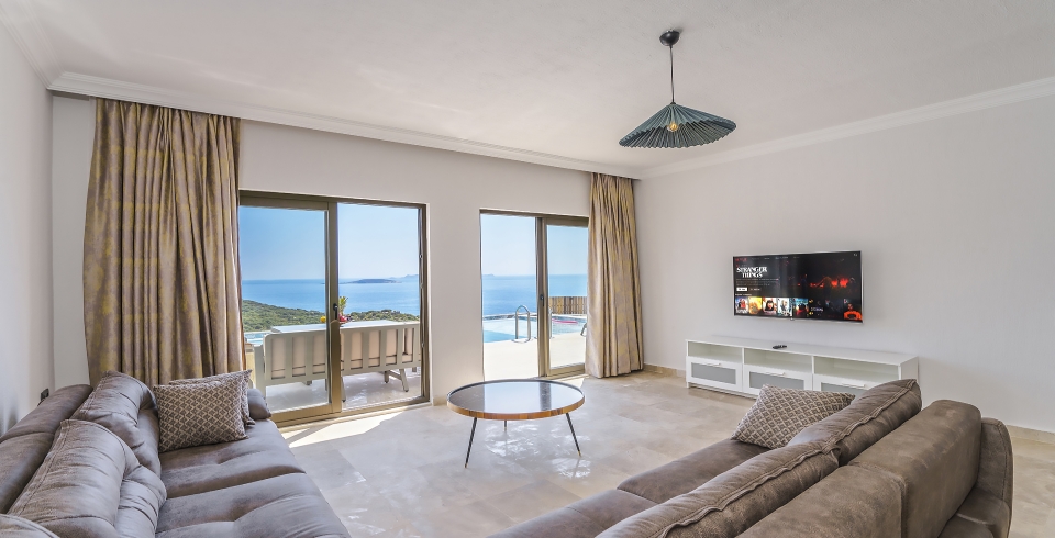 Salon : villamızın salon kısmında; Oturma grubu, televizyon, klima, sehpa, internet ve havuz terasına çıkış bulunmaktadır.