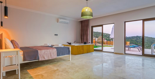 2. Yatak Odası: 1 Adet çift kişilik yatak, klima, elbise dolabı, komodin, makyaj masası, jakuzi, tuvalet ve banyo bulunmaktadır.