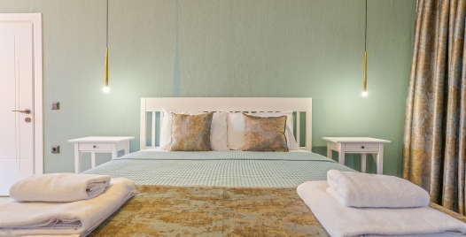 1. Yatak Odası: 1 Adet çift kişilik yatak, klima, elbise dolabı, komodin, makyaj masası, jakuzi, tuvalet ve banyo bulunmaktadır.