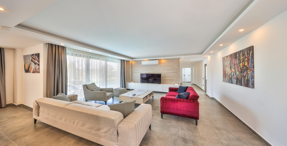 Salon : Salon içerisinde oturma grubu, TV, klima, sehpa bulunmaktadır. Havuz terasına çıkış yapılabilmektedir.
