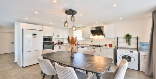 Mutfak : Modern Amerikan mutfak içerisinde buzdolabı, bulaşık makinası, fırın, ocak, mikrodalga, tost makinası, kahve makinası, çaycım, yemek masası, yemek takımları, çatal ve bıçak takımları, tencere ve tava takımları, bardaklar bulunmaktadır.