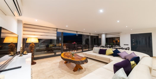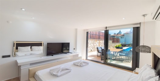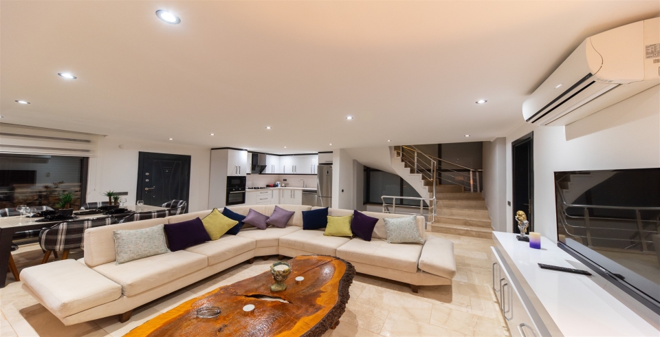 Salon : Salon içerisinde oturma grubu, televizyon, klima, sehpa, yemek masası, internet bulunmaktadır. Havuz terasına çıkış yapılabilmektedir.
