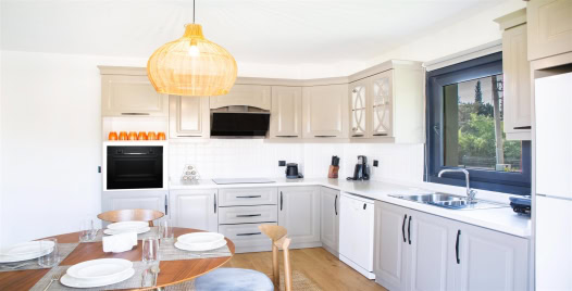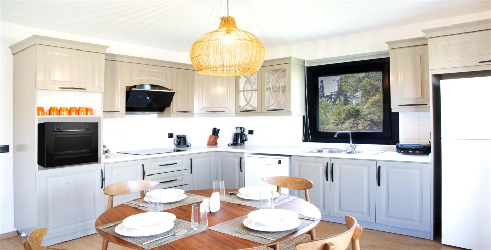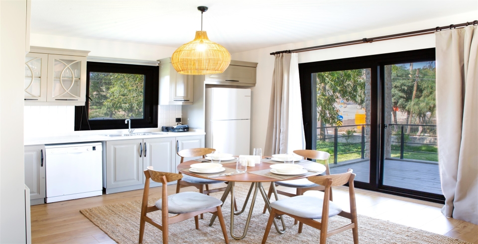Mutfak : Modern Amerikan mutfak içerisinde yemek masası, mama sandalyesi, buzdolabı, bulaşık makinası, fırın, ocak, mikrodalga fırın, tost makinası, yemek masası, yemek takımları, çatal ve bıçak takımları, tencere ve tava takımları, bardaklar bulunmaktadır.