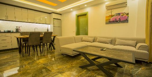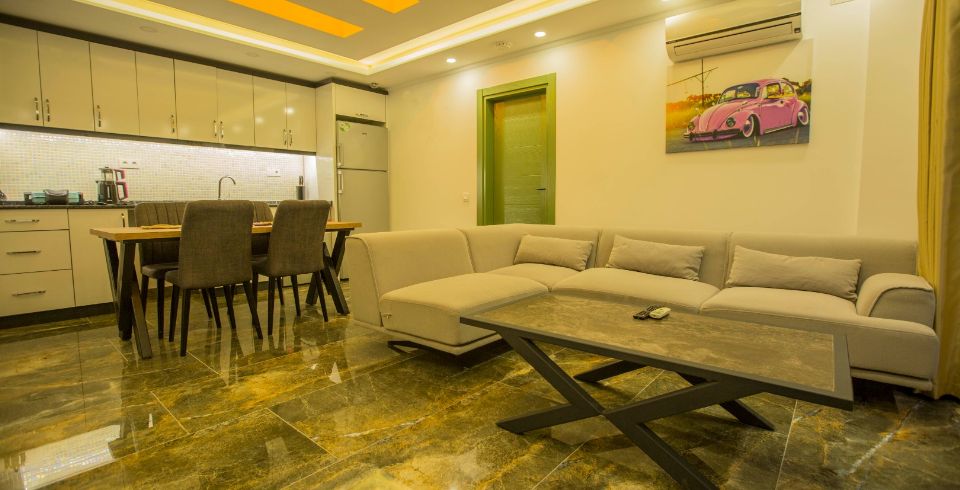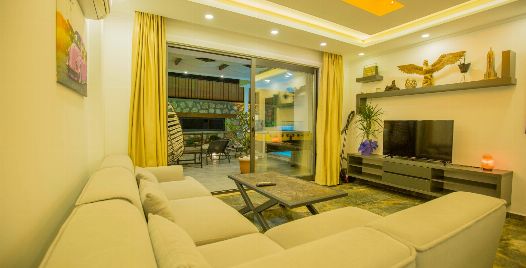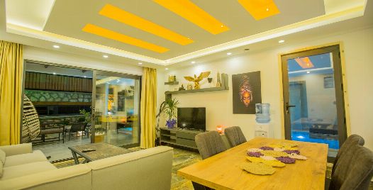 Salon : Yemek masası, Oturma grubu, TV, açık mutfak ve havuz terasına çıkış bulunmaktadır.