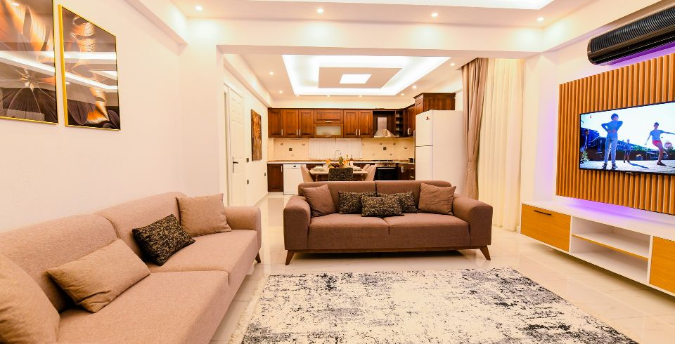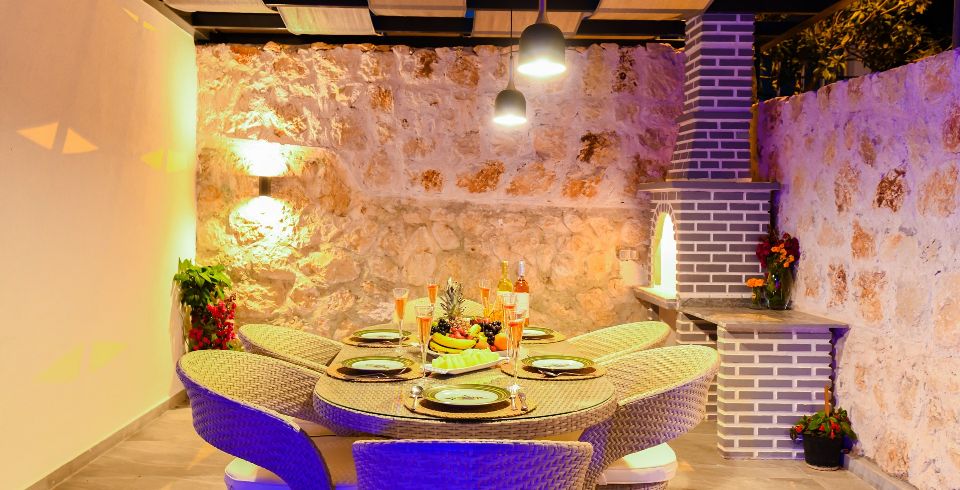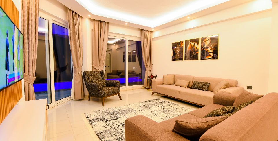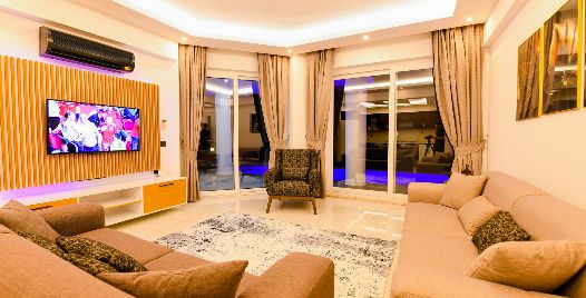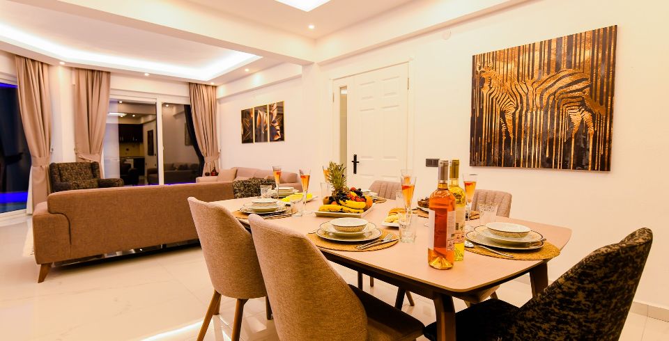Salon: Villa salonunda konforlu oturma grubu, klima, TL, internet, uydu alıcı, yemek masası, sehpa bulunmaktadır.