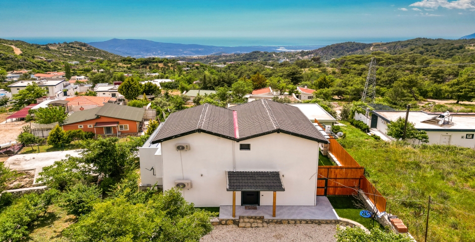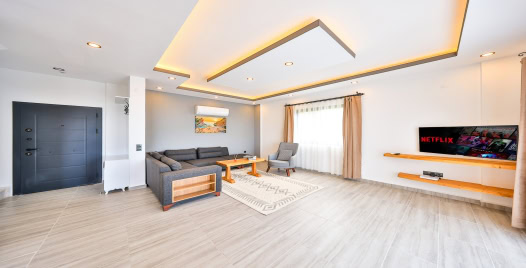 Salon : Villamızın iç dizaynı da son modaya uygun olarak modern bir şekilde tasarlanmıştır. Çeşitli dekoratif eşyalarla süslediğimiz salonumuz havuzlu bahçeye açılıyor. Villa salonunda oturma grubu, TV, internet, klima, sehpa bulunmaktadır.