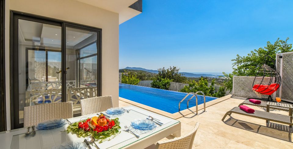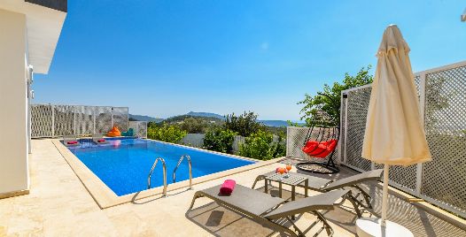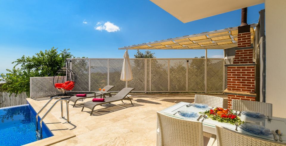 Bahçe : Villamızın bahçesinde özel yüzme havuzu, güneşlenmeniz için 4 adet şezlong, güneşlenme terası, 4 kişilik masa, oturma grubu, mangal keyfiniz için barbekü, güneş şemsiyesi bulunmaktadır.