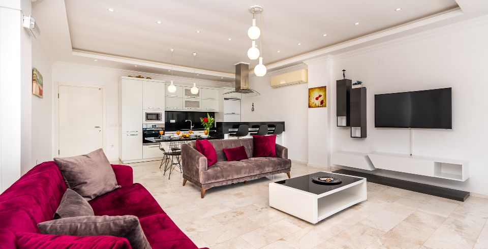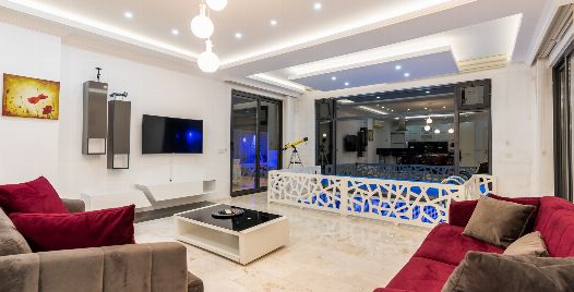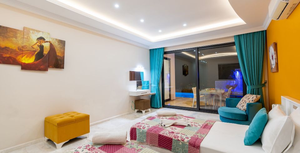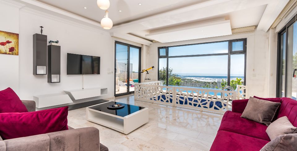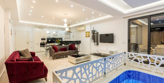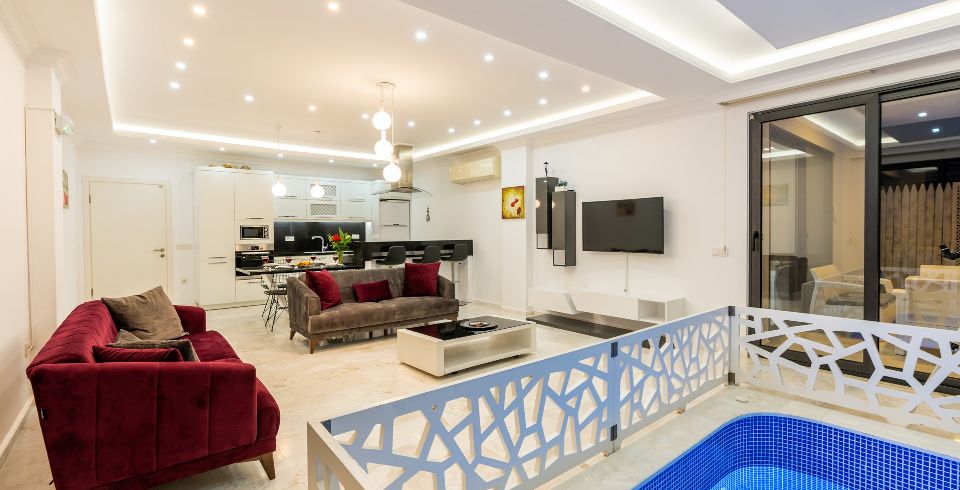 Salon : Villa Nur’un salonunda sizi şık bir oturma grubu ile klima, televizyon, internet, uydu, koltuk, sehpa ile ferah bir salon bekliyor olacaktır. Havuz terasına çıkış yapılmaktadır.