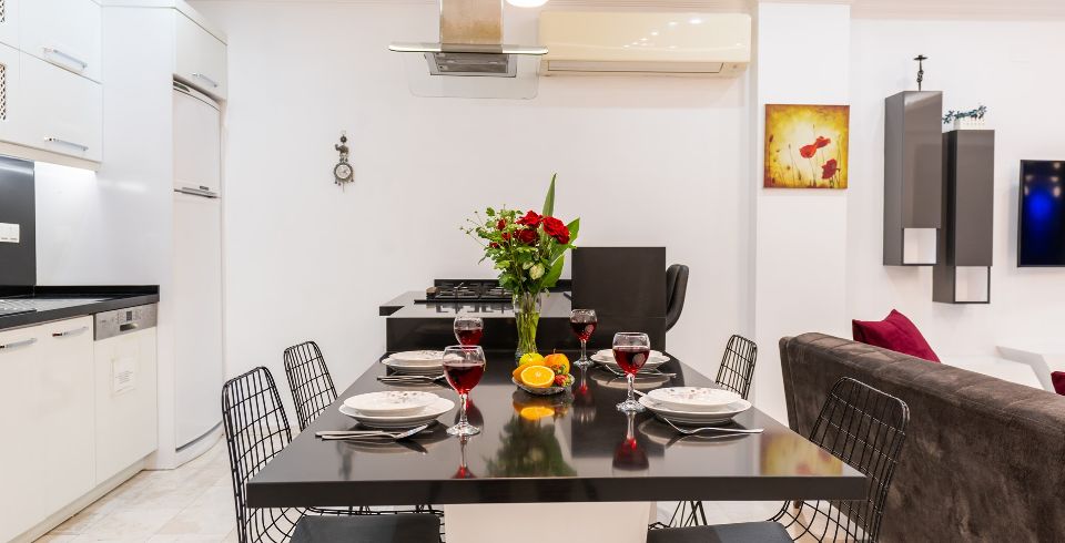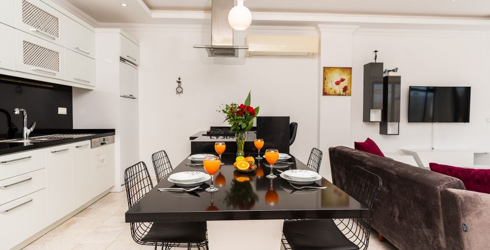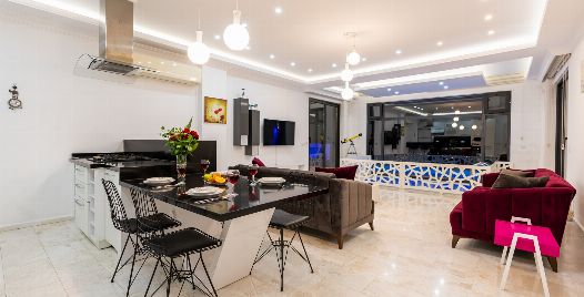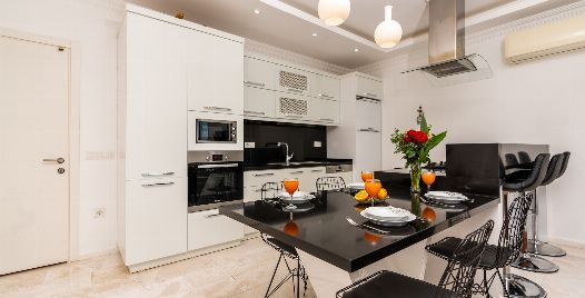 Mutfak : Villamızın geniş Amerikan mutfağı ile sizlere kendi evinizin mutfağı gibi hissettirecek. Ayrıca mutfakta klima, bulaşık makinası, buzdolabı, çamaşır makinası, mikrodalga fırın, tost makinası, ekmek kızartma, su ısıtıcısı, fırın, 4`lü ocak seti ve 4 kişilik geniş yemek masası ile tava tencere vb. mutfak araç gereçlerini kullanma fırsatını sizlere sunuyoruz.