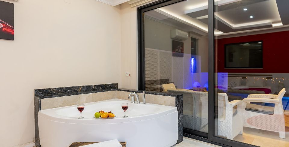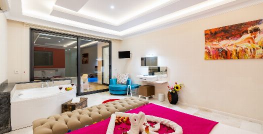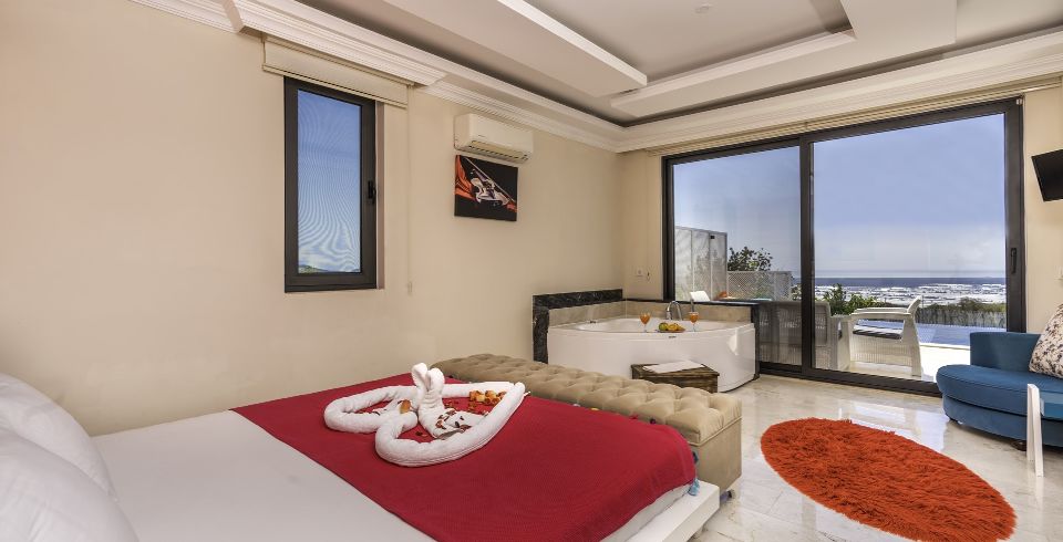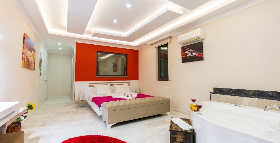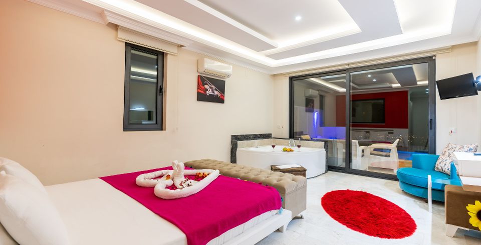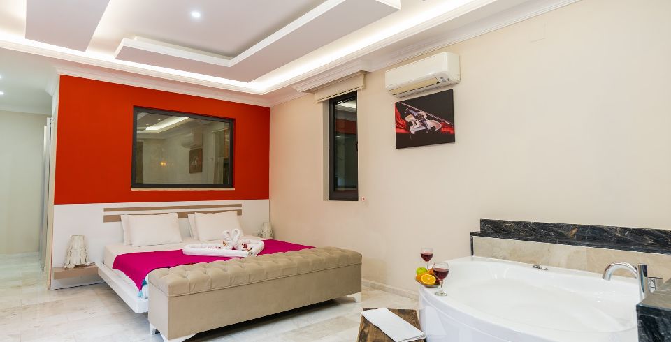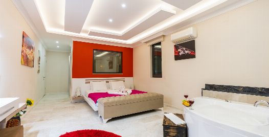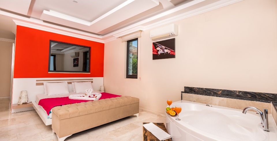 1. Yatak Odası : 1 adet çift kişilik yatak, klima, jakuzi, komodin, elbise dolabı, makyaj masası, banyo ve lavabo bulunmaktadır.