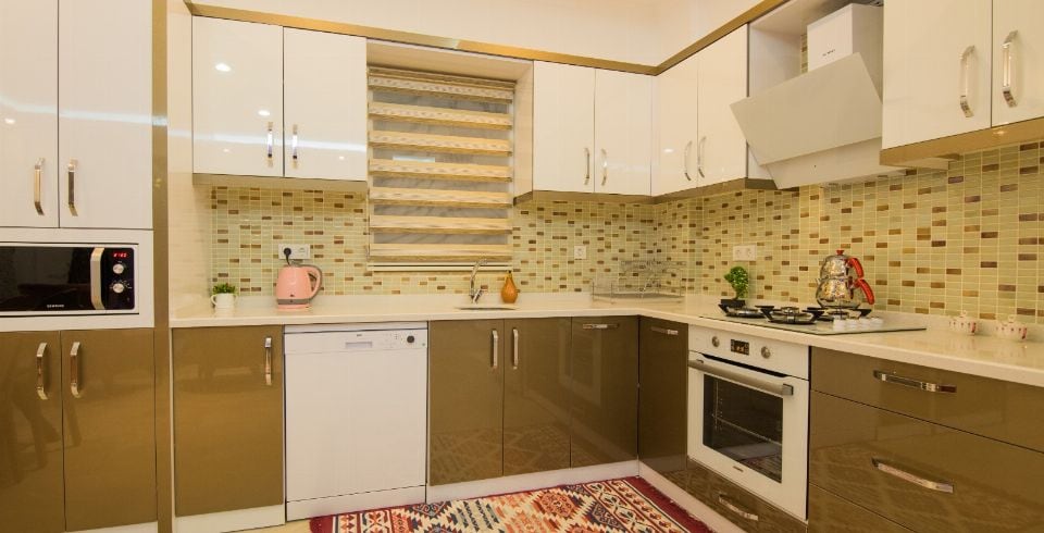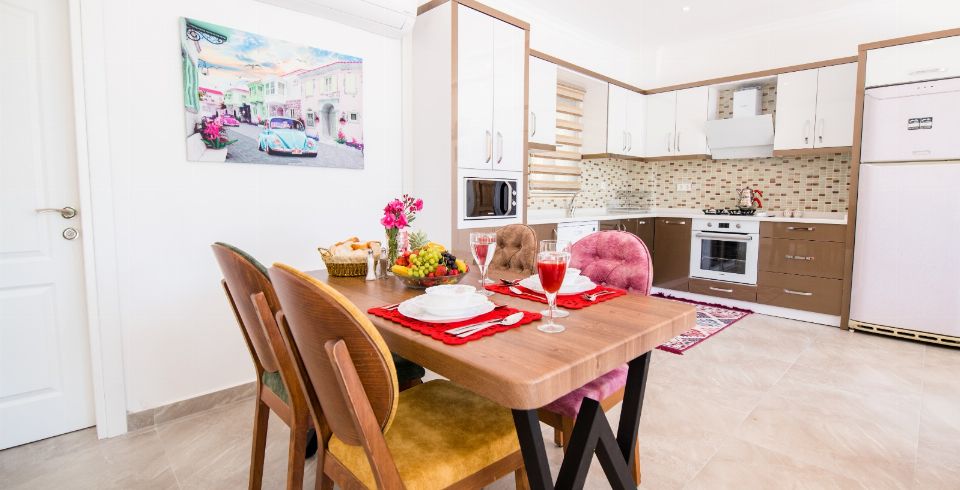 Mutfak : Modern Amerikan mutfakta buz dolabı, bulaşık makinası, 4'lü ocak, fırın mikrodalga fırın, kettle, 4 kişilik yemek masası, yemek takımları, çatal ve bıçak takımları, tencere ve tava takımları, bardaklar bulunmaktadır.