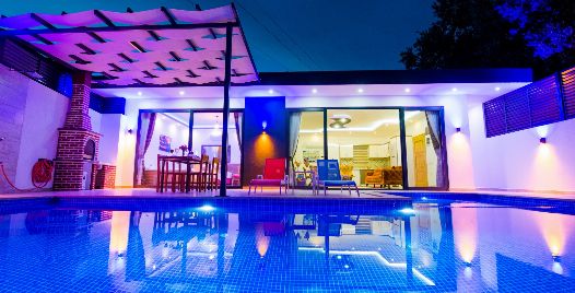 Havuz : Havuz terası korunaklı olup dış taraftan gözükmemektedir. Villamızın havuz terasında şezlong, şemsiye, mangal ve oturma grubu bulunmaktadır.